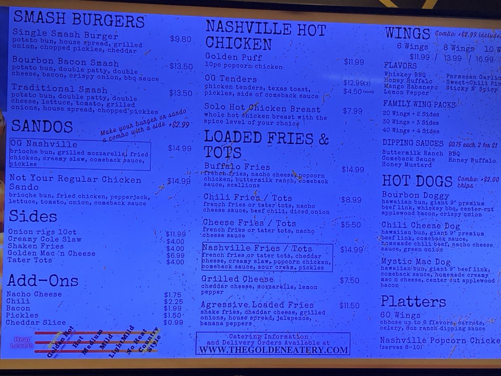 Introducing the menu at The Golden Eatery, a Latinx-owned restaurant located in Santa Ana, CA. The diverse menu features mouth-watering options such as double smash burgers, Nashville hot chicken, loaded fries, wings, and hotdogs. Customers rave about the juicy and flavorful smash burgers, with toppings like grilled onions, pickles, cheese, and special sauce on a potato bun. The Nashville hot chicken is a must-try, with a perfect balance of spice and flavor. Pair your meal with crispy tater tots or seasoned fries for the ultimate experience. The Golden Eatery offers a variety of options for all taste preferences, making it a go-to spot for delicious comfort food. Don't miss out on the culinary delights and vibrant atmosphere at this hidden gem in Santa Ana.